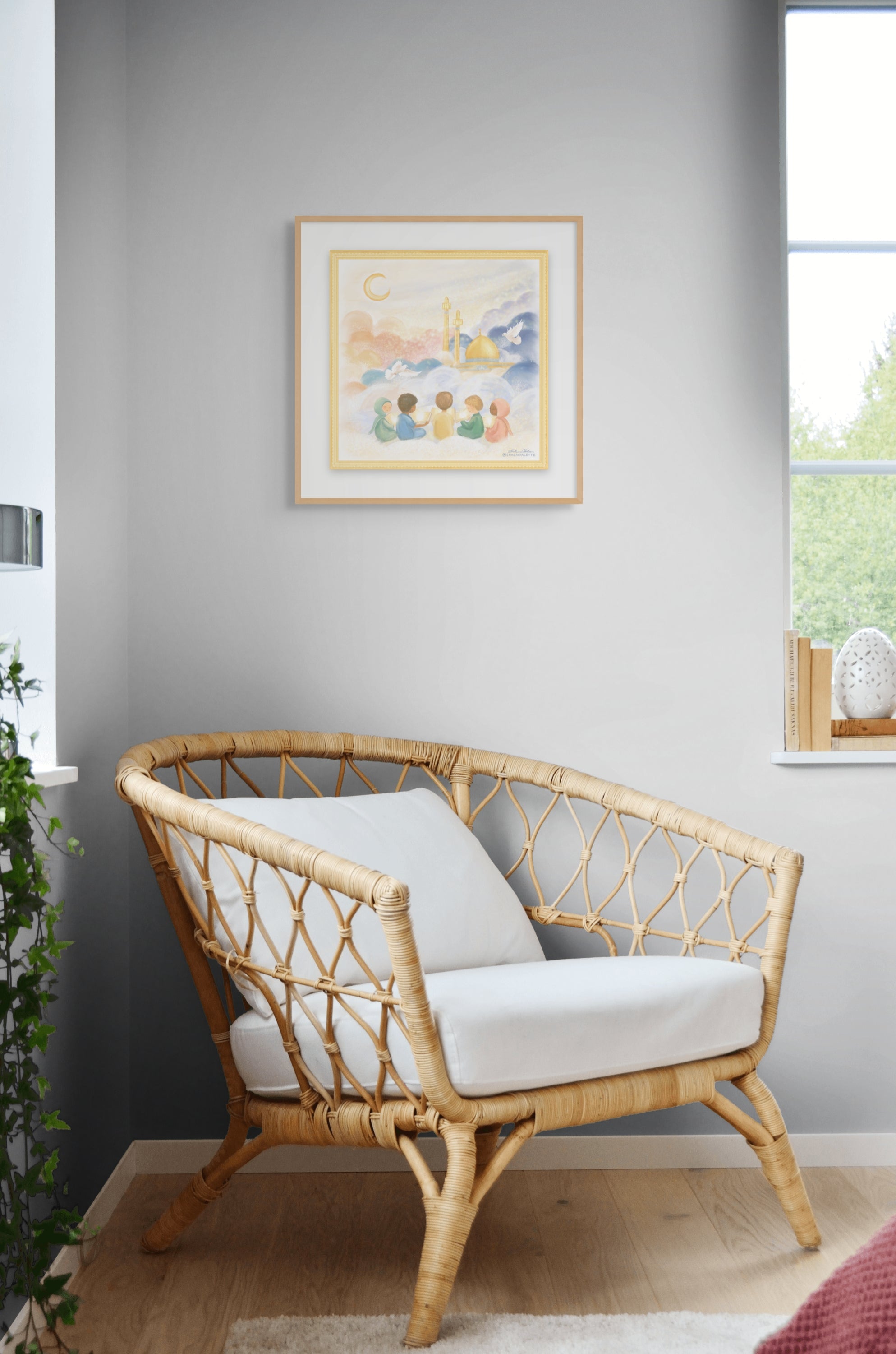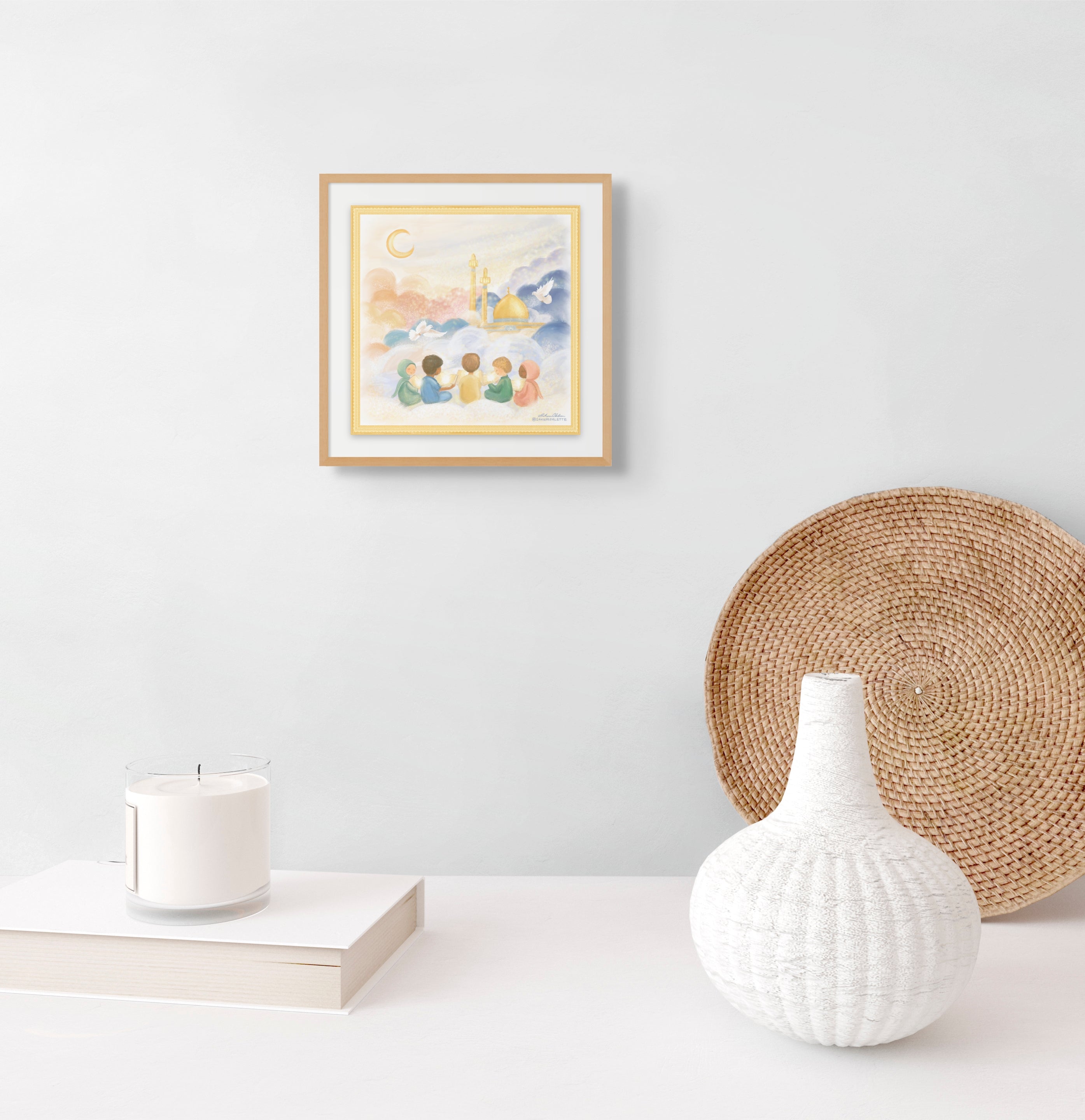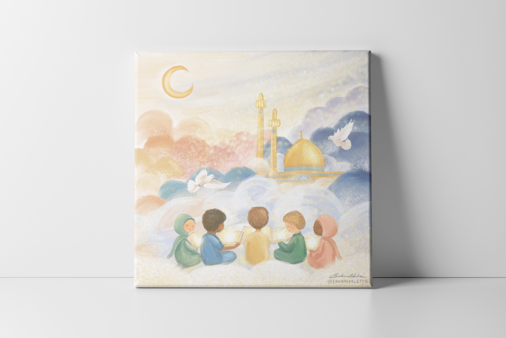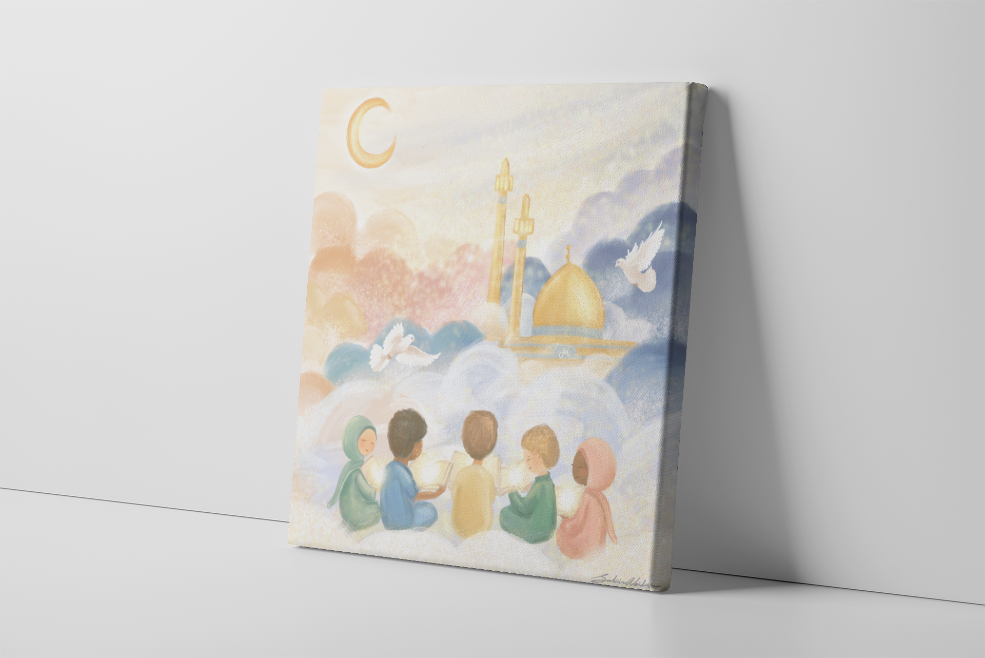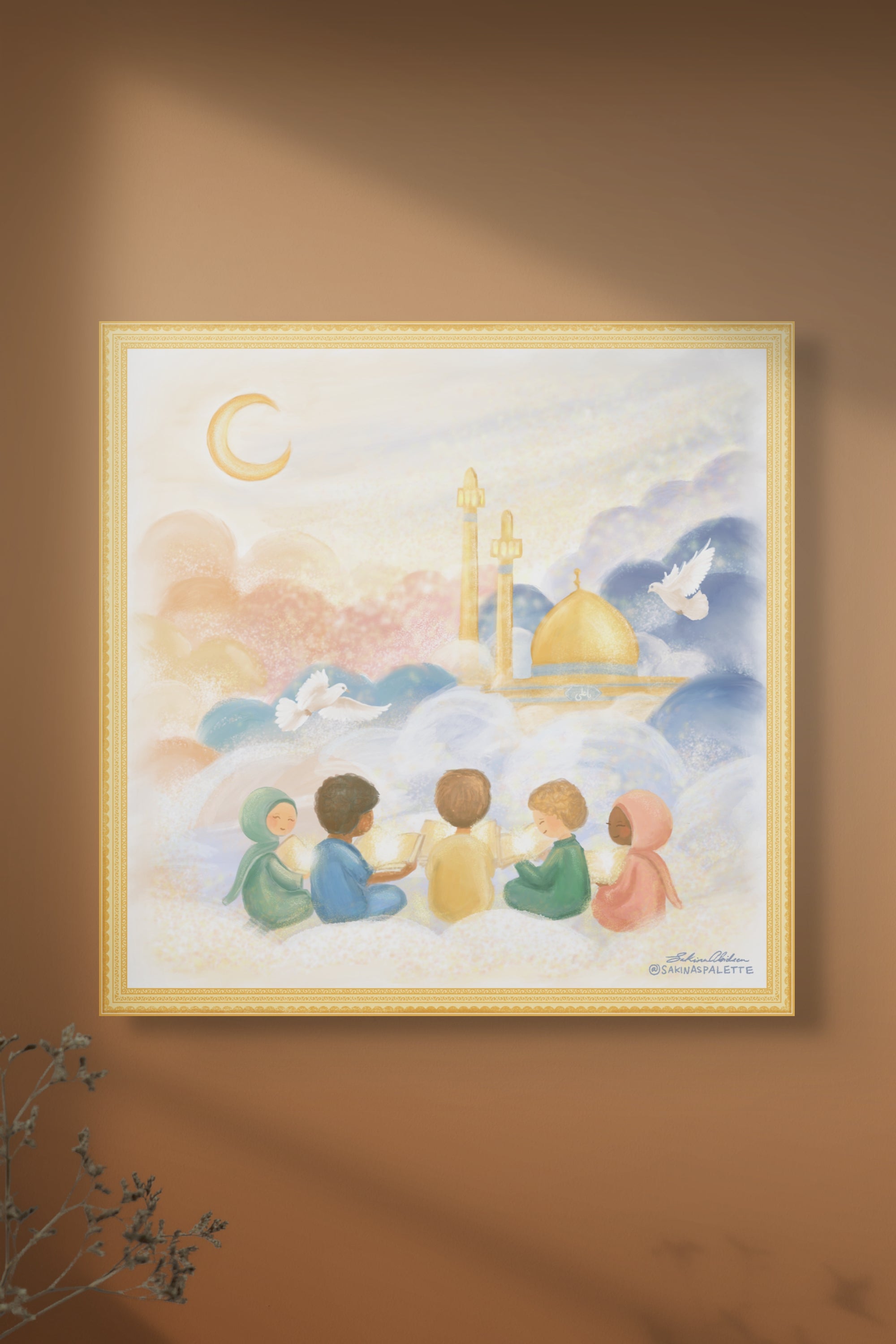 Perfect for a children’s room, this artwork depicts a group of children reading and illuminating the Quran while resting on... Read more