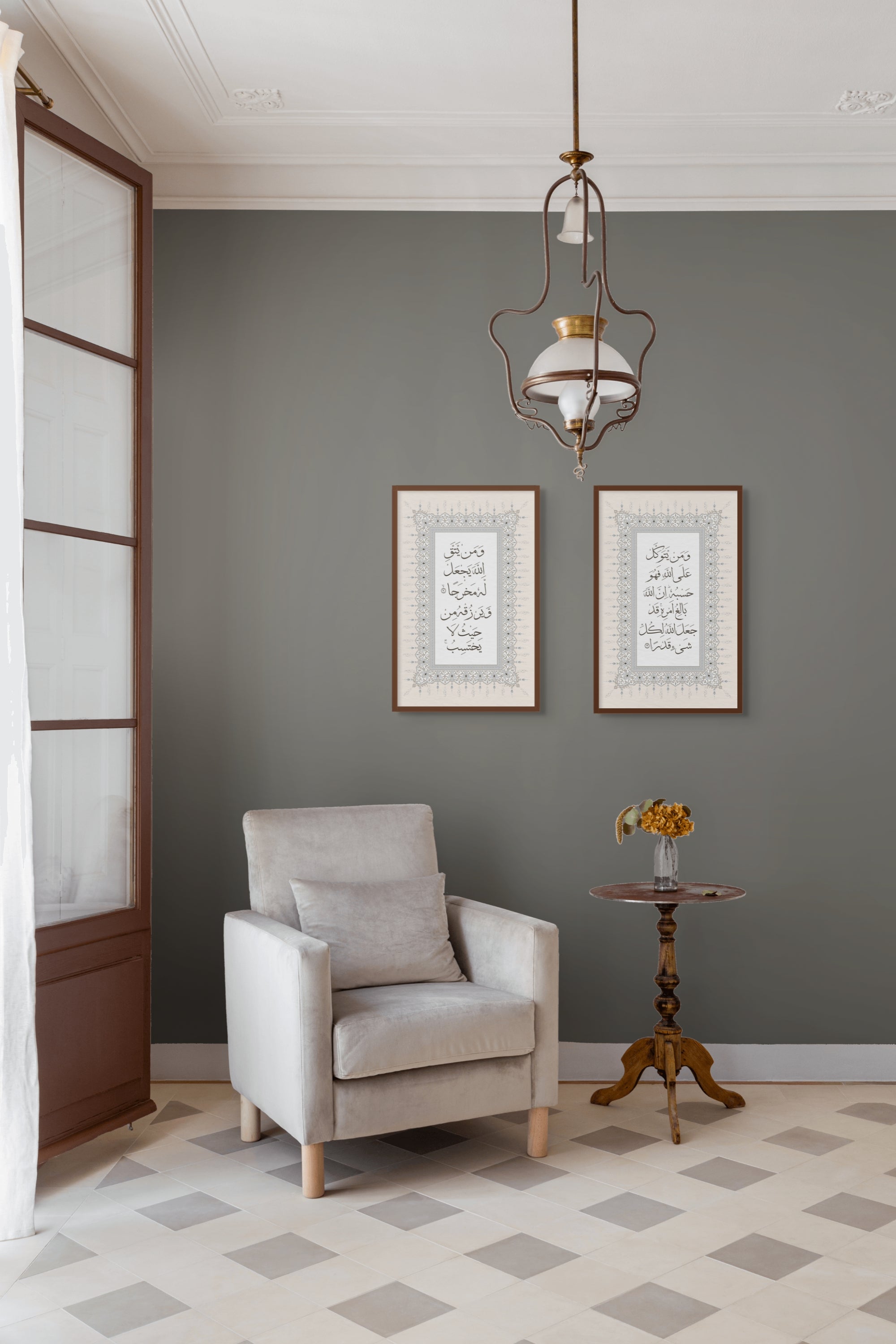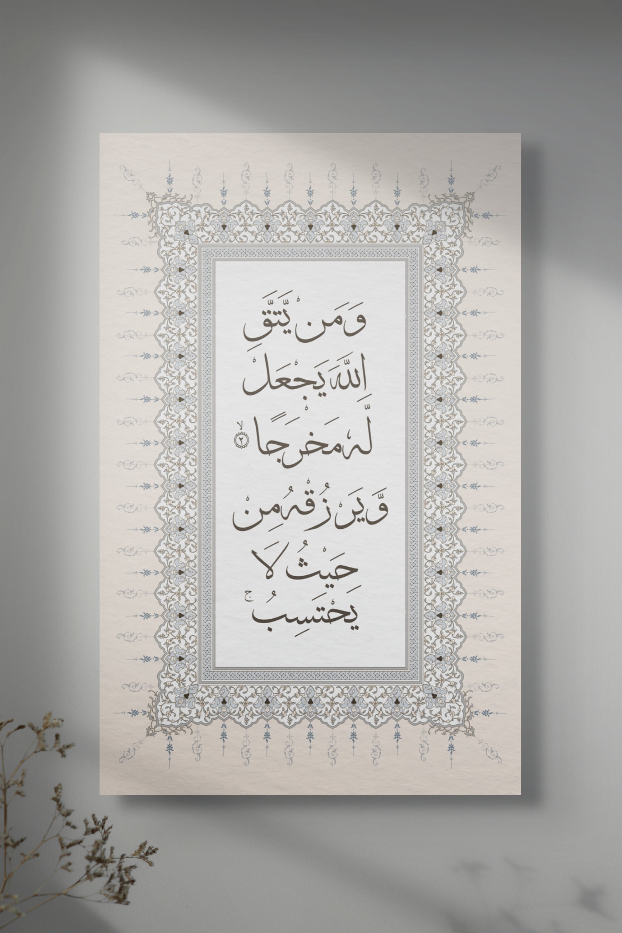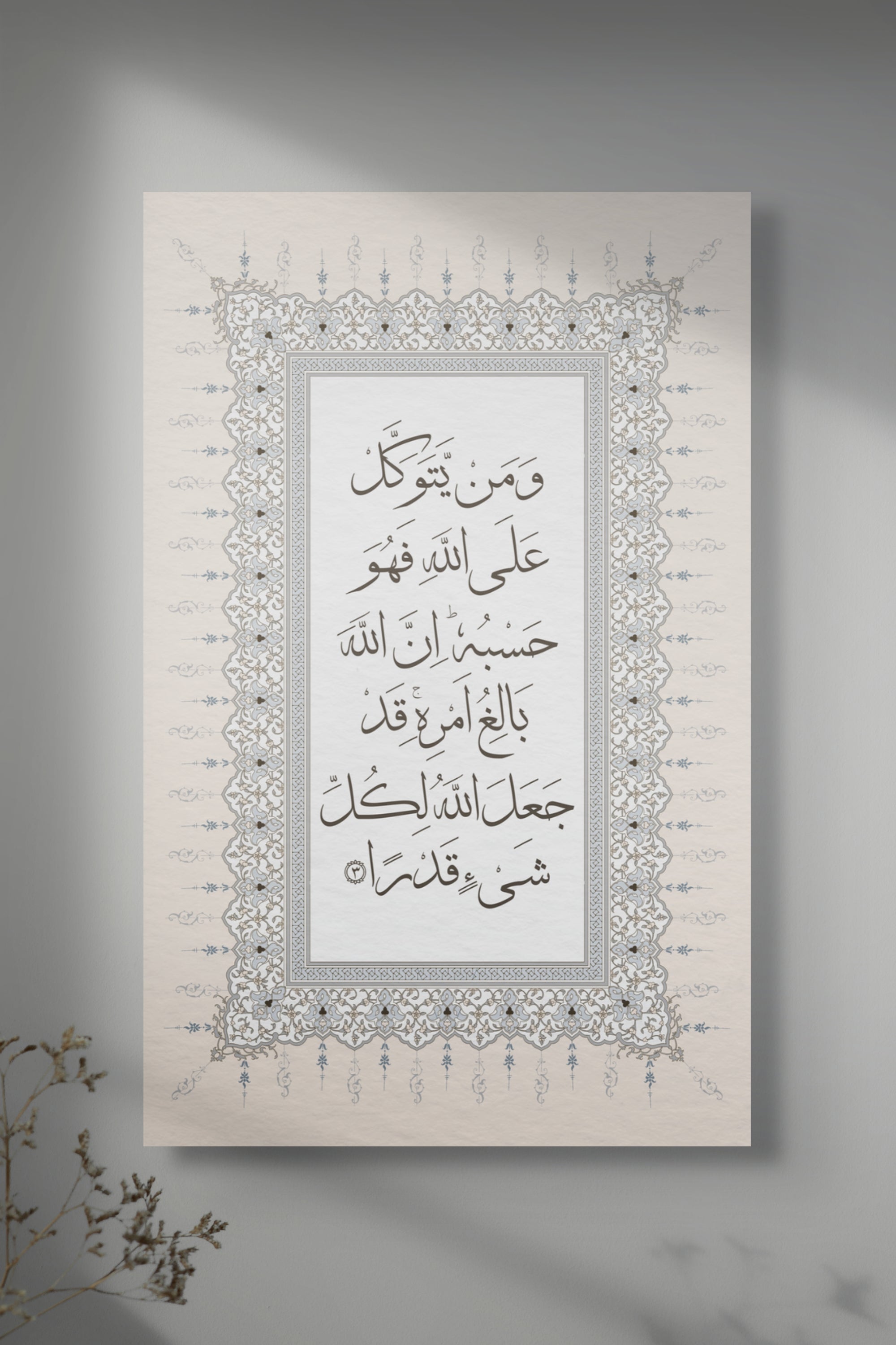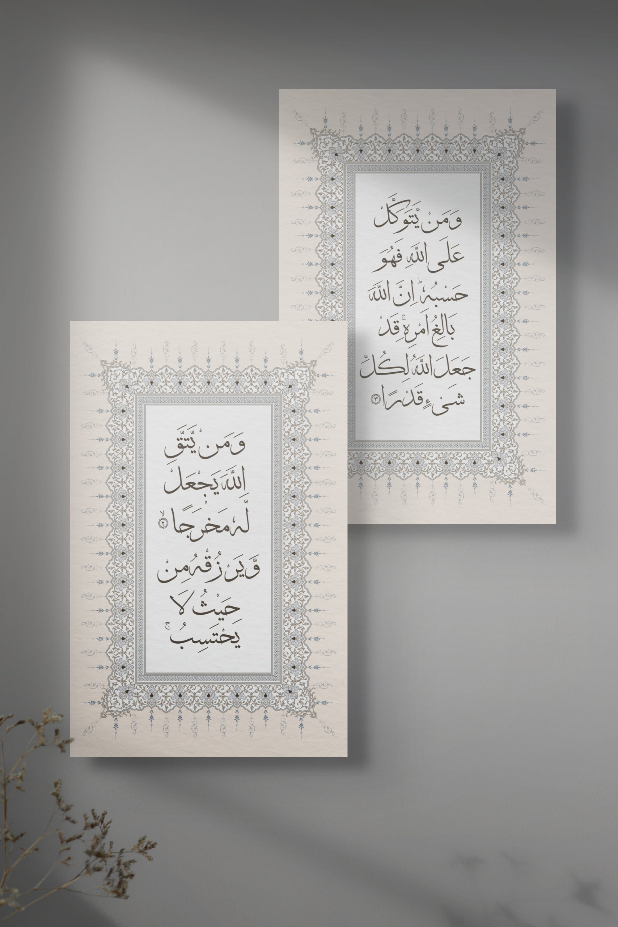 These artwork set features Surah At-Talaq, Ayahs 2–3 written in the elegant Thuluth style of Arabic calligraphy: